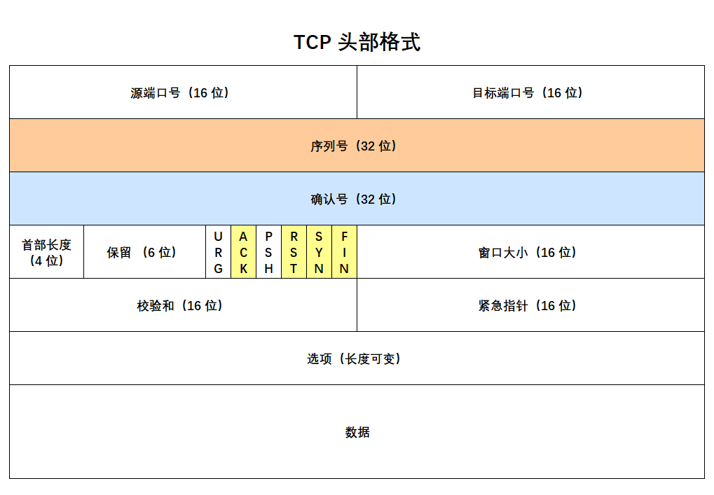 - 复位 RST,当 RST = 1,表明 TCP 连接中出现严重差错,必须释放连接,然后再重新建立连接;