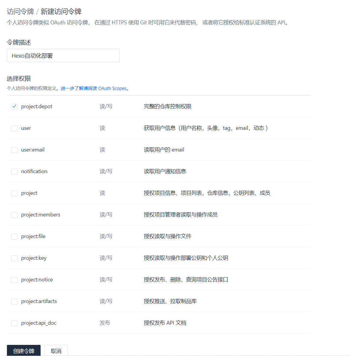若您的Hexo源码在Coding仓库托管,则需要新建一个Coding访问令牌。若您的Hexo源码在Github仓库托管,则需要新建一个Github Token。